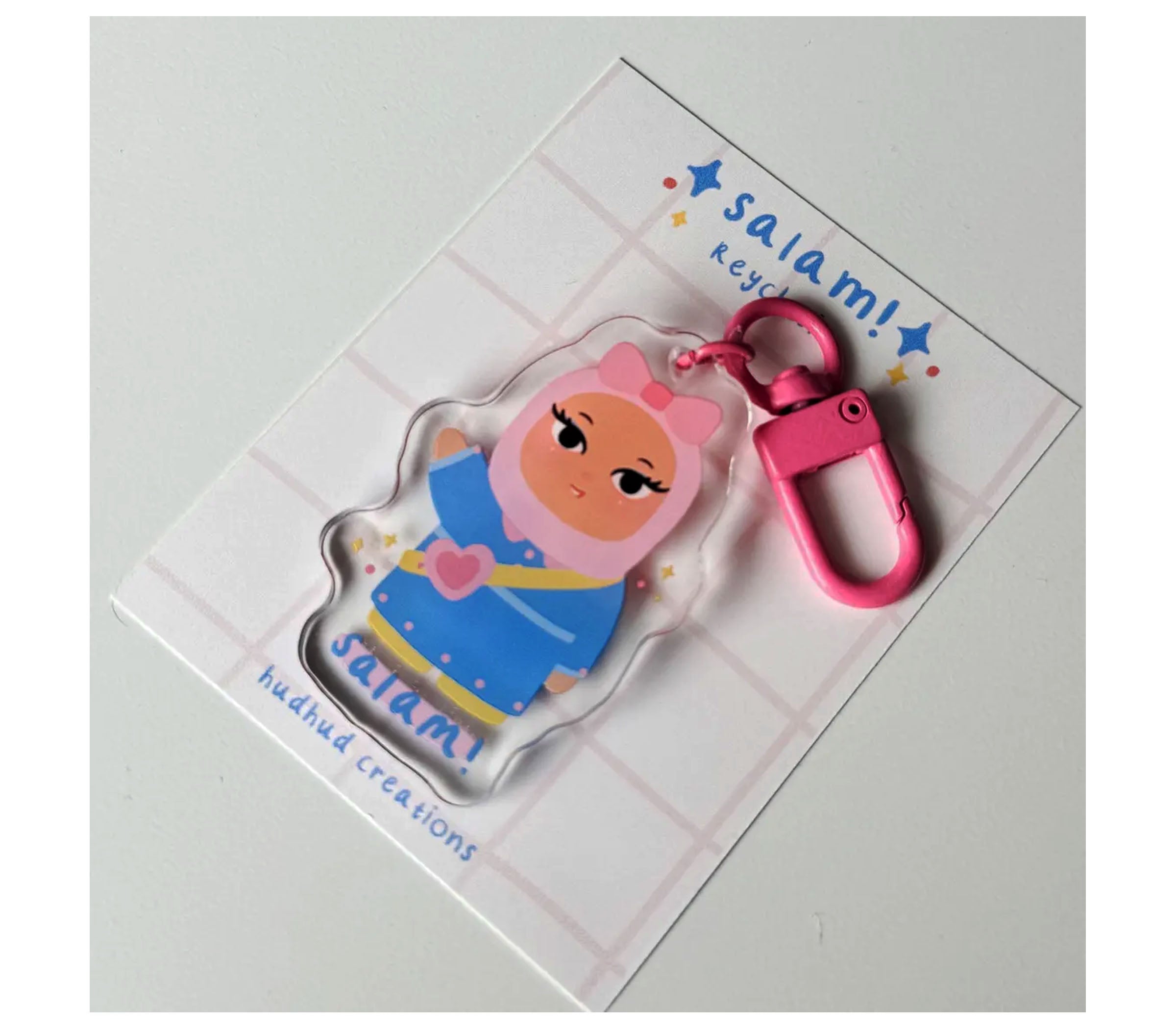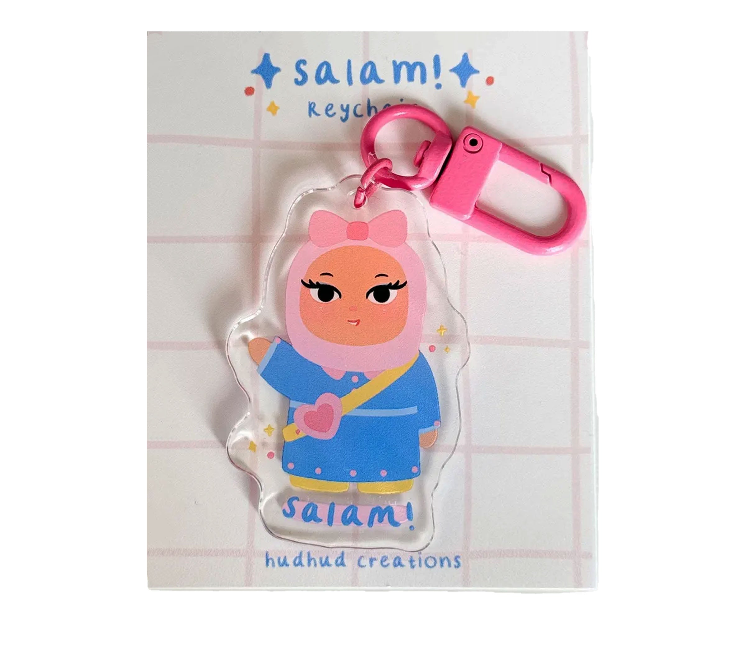 This is an adorable keychain featuring a little hijabi dressed in bright blue with a heart bag, a cute bow, and waving salam. Underneath the vibrant illustration is the lettering "Salam!".