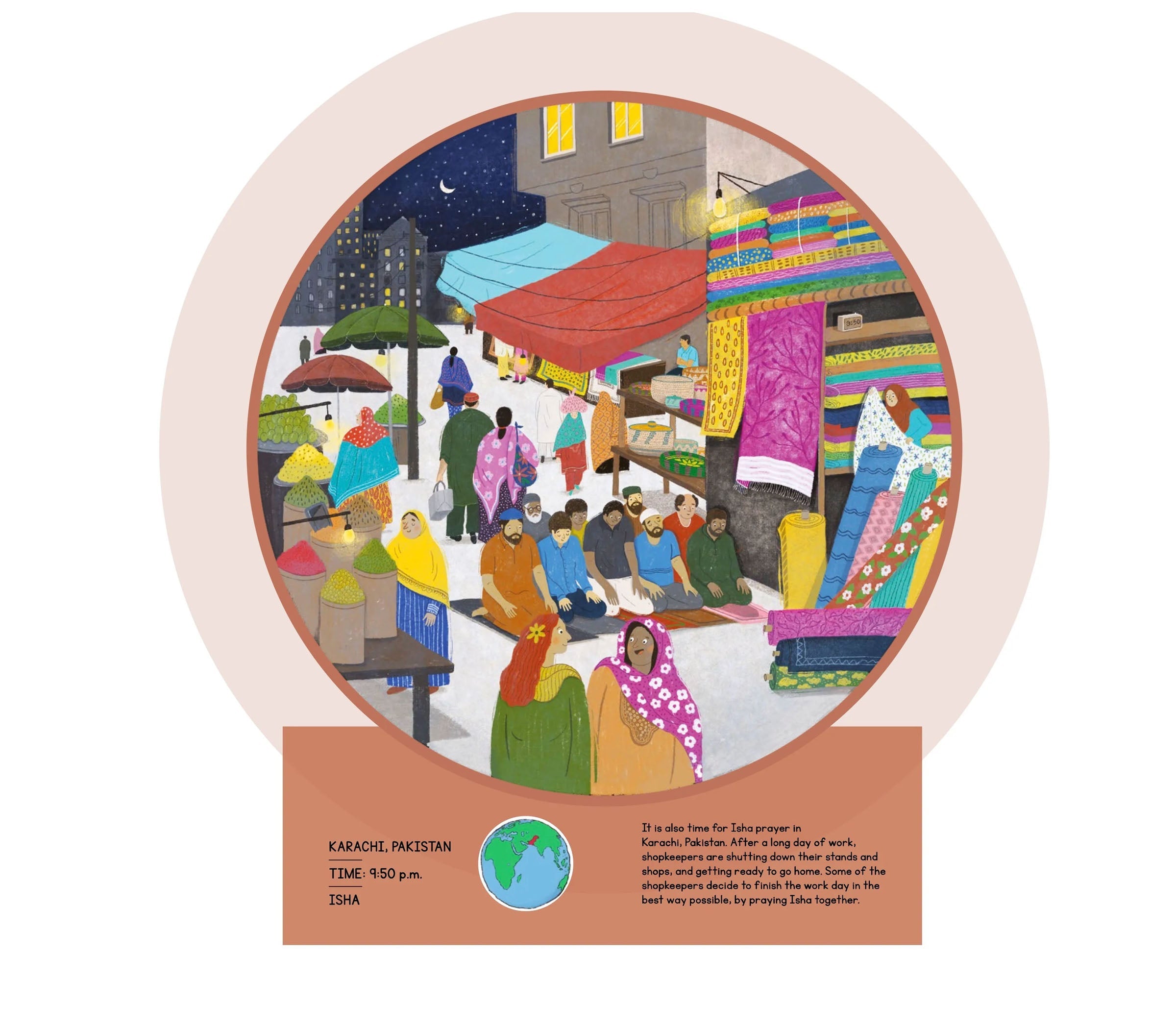 A World Always Praying is a beautifully crafted book with a unique circular shape, symbolizing the continuous connection of Muslims through prayer. Each page takes young readers on a journey across the world, showing how people from different cultures turn to Allah in salah.