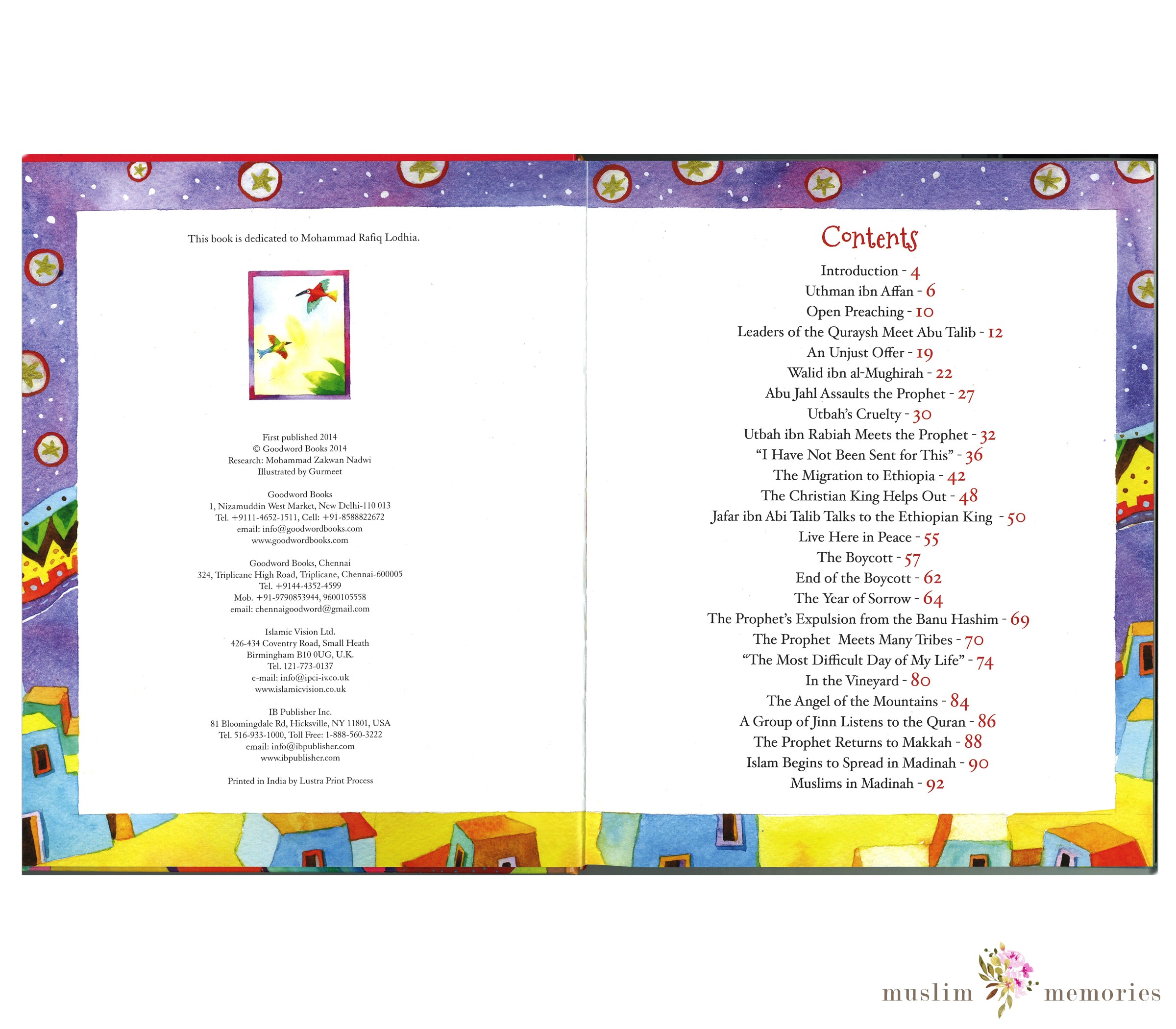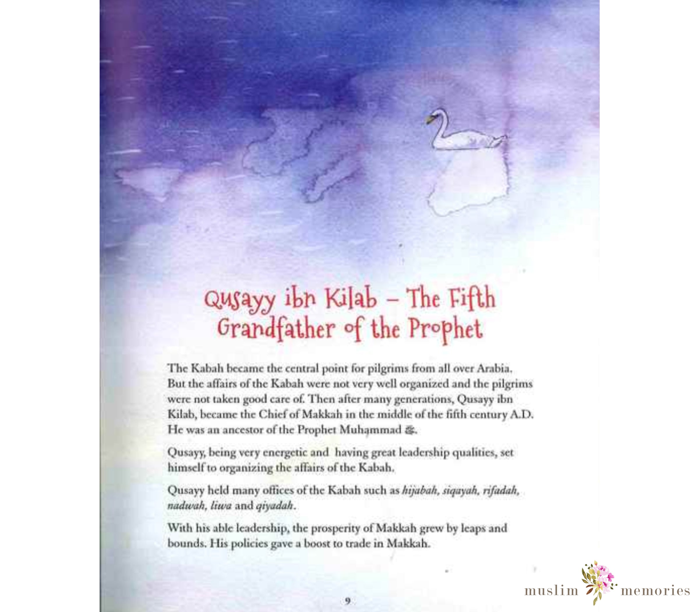 The Prophet Muhammad Storybook takes you back to the early days of Makkah, to a period long before the birth of the Prophet Muhammad. It relates fascinating stories about the Kabah and how the pilgrimage to it and trade with far-off lands such as Yemen, Syria, Iraq, Persia were organized along the silk route by the Prophet?s great-grandfather. Everything is covered from the re-digging of the Zamzam well to the year of elephants, to the birth of the Prophet Muhammad, and then on to his childhood in the desert and his early life in Makkah.