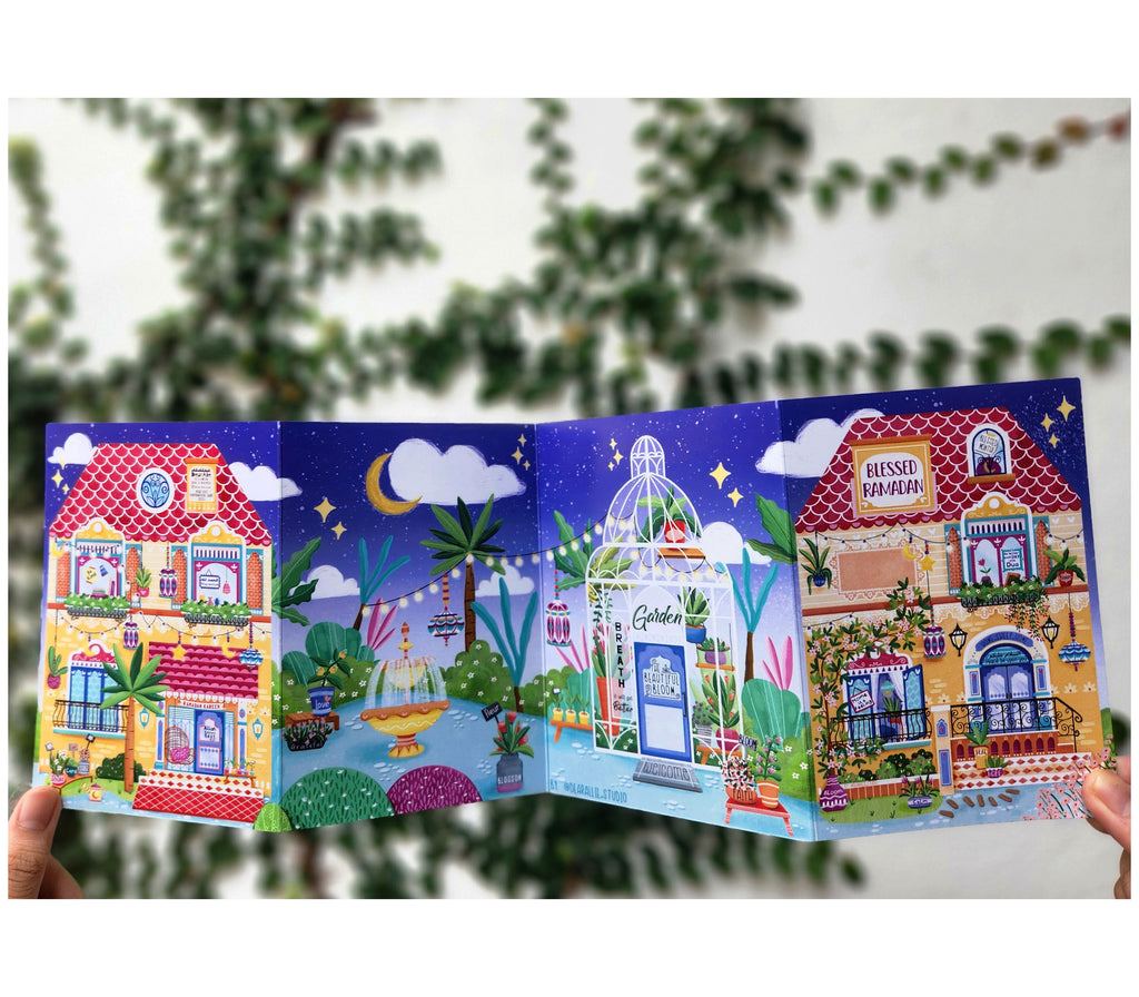 Extend the warmth of My Ramadan Paper House Card with this beautiful mini Concertina Card (10.5 x 42 cm), featuring a row of charming houses and a peaceful garden scene. Inside, discover four panels for Ramadan reflection, wishes, and daily goals—more than just a greeting card, it’s a meaningful way to reflect and set intentions for yourself or your loved ones.