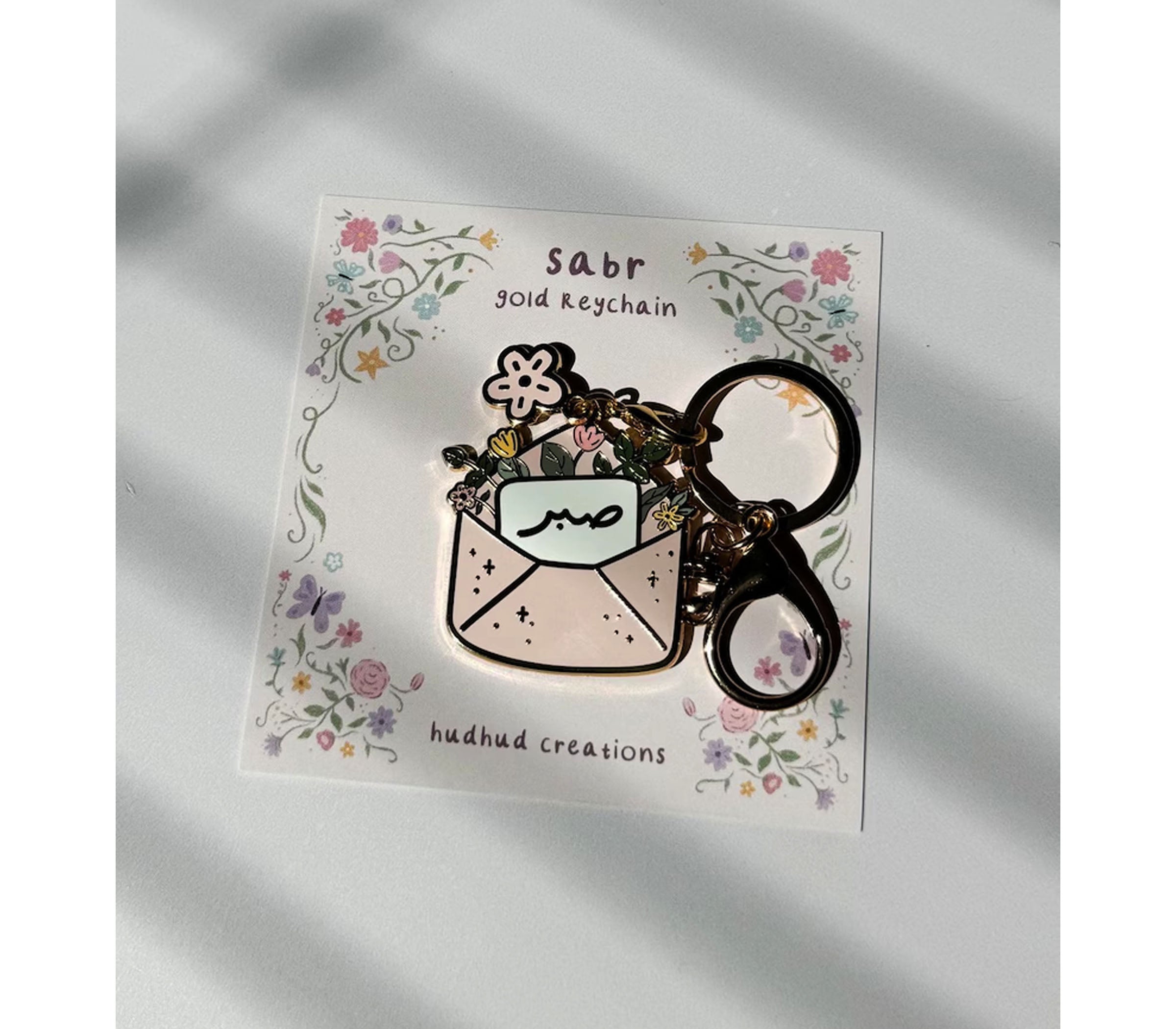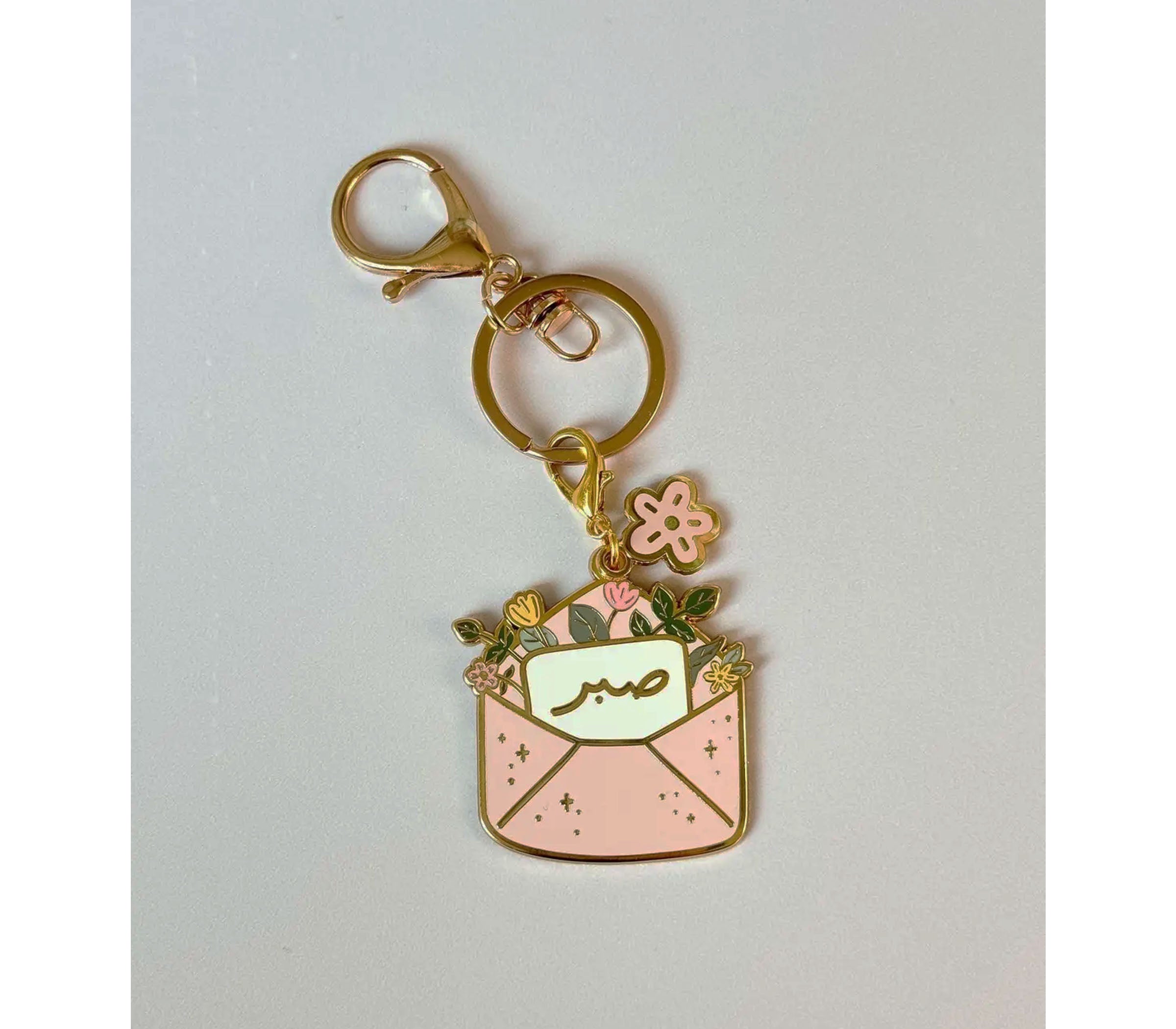 This is a gorgeous, gold plated keychain of the Arabic word "Sabr," which can be translated to patience. In the shape of an envelope and surrounded by gold sparkles and intricate pastel flowers, and accompanied by a little flower charm, it would make the perfect addition to your keys or bag.