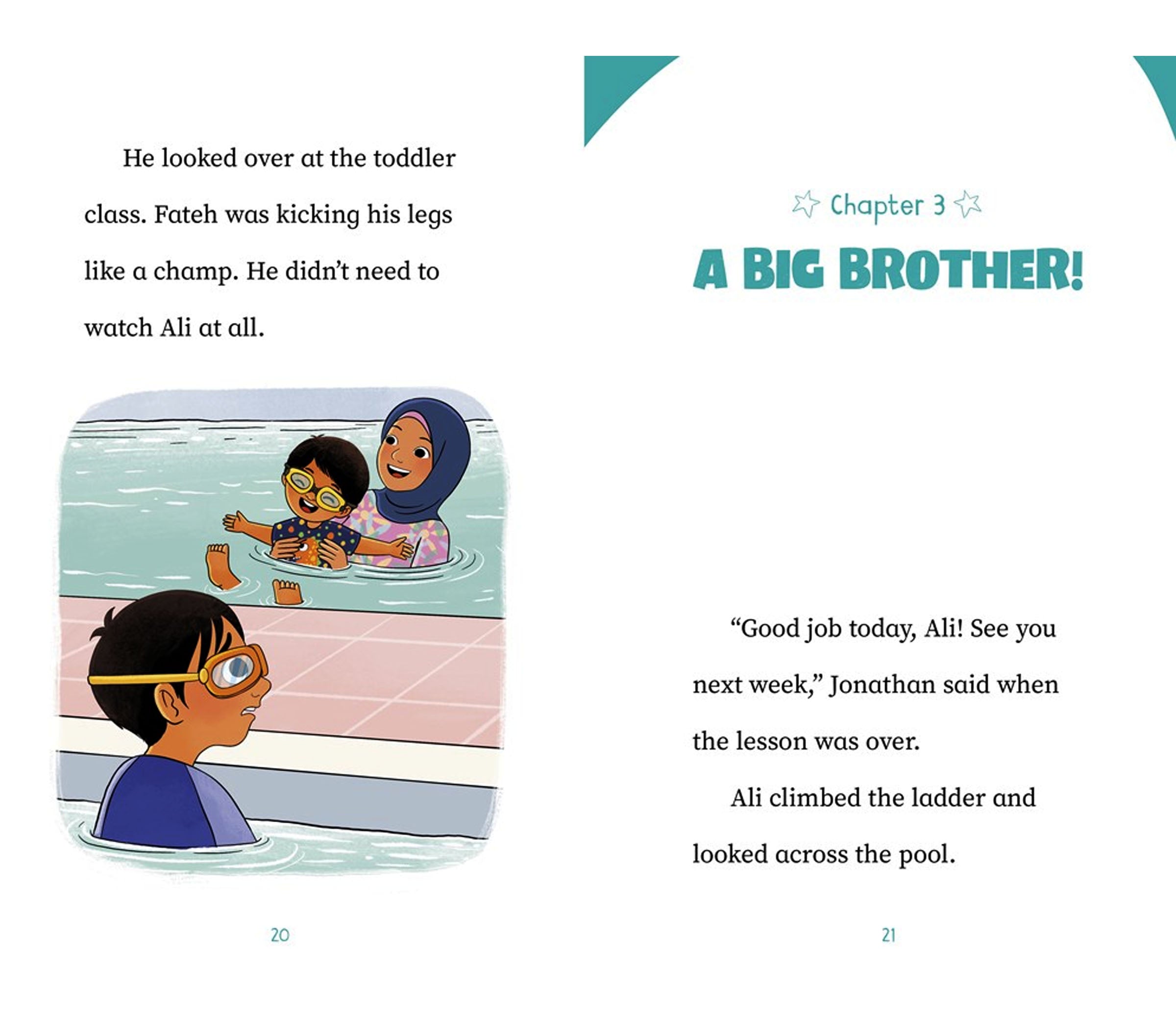 Ali is excited to show off his swimming skills to his little brother, Fateh. But when they get to the pool, Ali realizes he has forgotten a few things. To make matters worse, Fateh is taking to the water like a fish! Ali’s pride is hurt, but it turns out that little Fateh still needs his big brother after all.