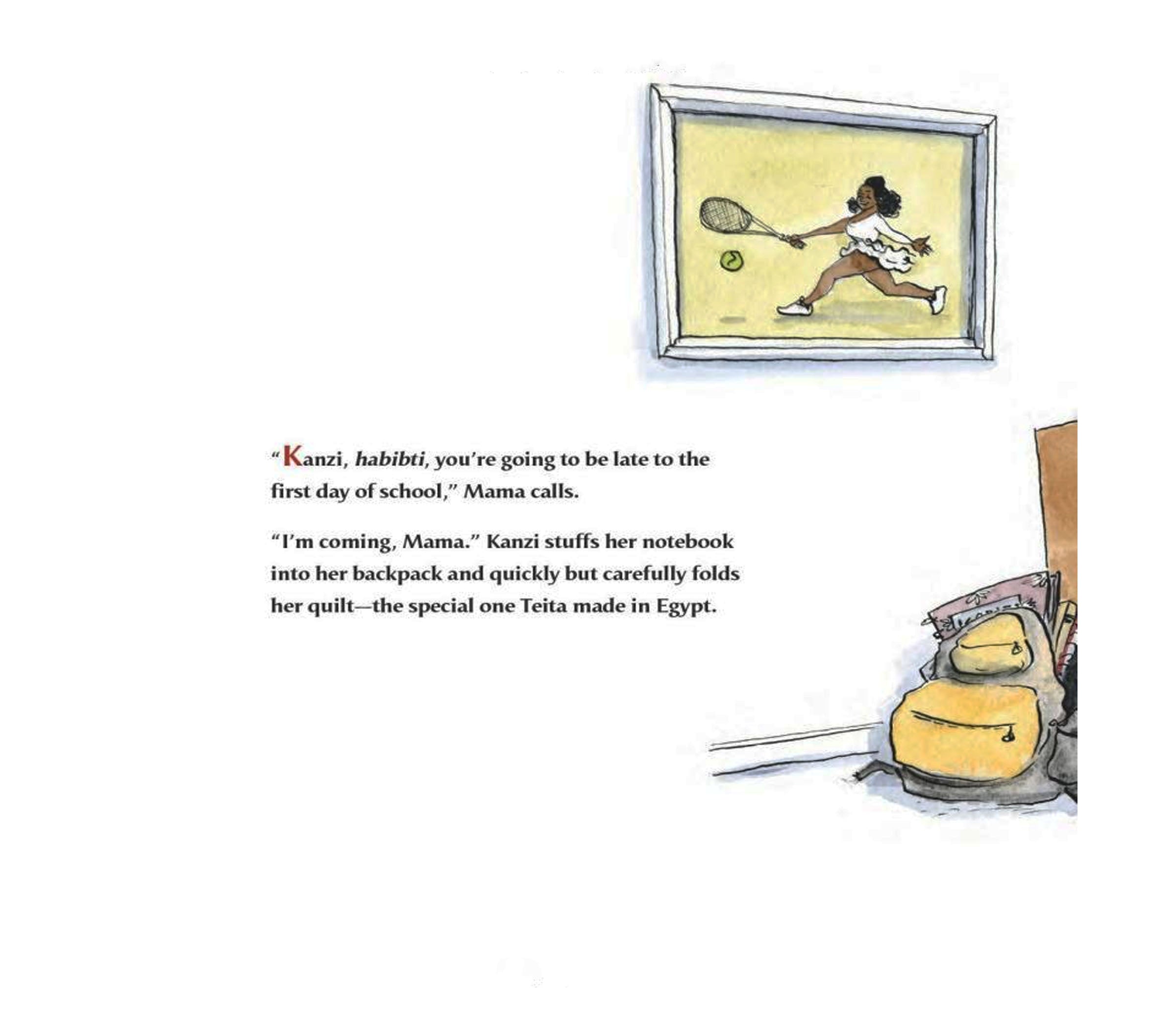 That night, Kanzi wraps herself in the beautiful Arabic quilt her teita (grandma) in Cairo gave her and writes a poem in Arabic about the quilt.