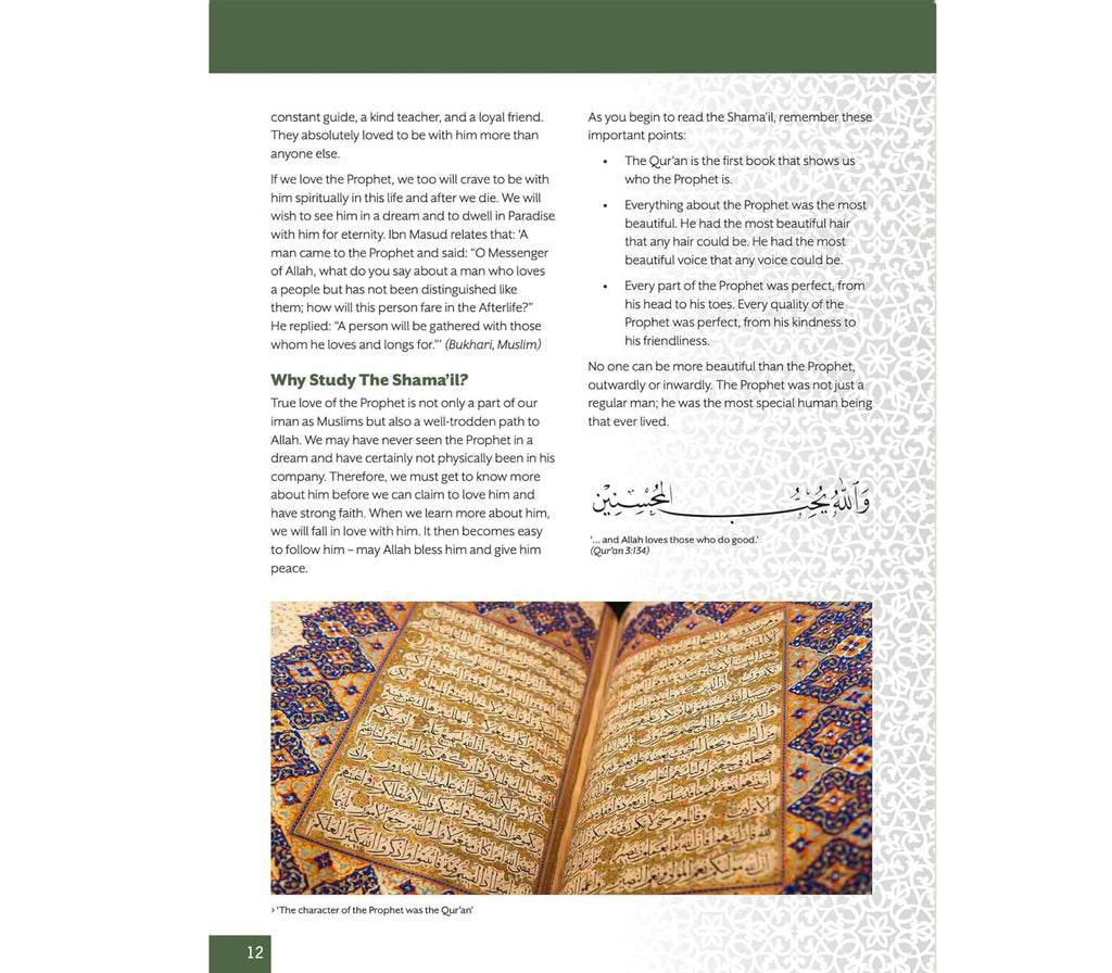 • Each chapter is dedicated to a particular characteristic, closely following the format of the original Arabic Shama’il text, and begins with a translation of ahadith